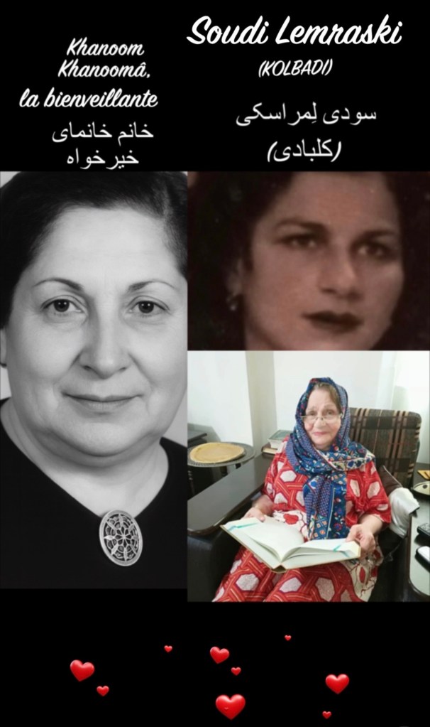 Malgré les épreuves et les blessures que la vie lui avait infligées, Khanoom Khanoomâ est toujours restée bienveillante et a continué ses actions de générosité. J’avais entendu beaucoup de choses à son sujet de la part des anciens et des aînés proches, qui me l’avaient raconté, mais moi-même aussi j’ai personnellement été témoin d’autres nobles gestes de ma chère maman… Elle m’a appris à être toujours donneuse dans la vie, et non receveuse.