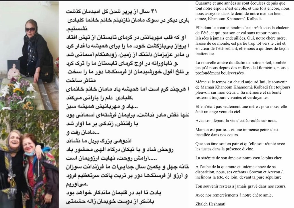 Nous sommes les dernières enfants de Khanoom Khanoomâ Kolbadi, c’est-à-dire Soozan et Arézou ; mais la vie d’Arézou est arrivée à son terme le 1er juin 2023. Avec une peine infinie, j’ai perdu ma chère Arézou bien trop tôt, et je suis certaine que maman l’a accueillie au ciel, où plus aucune souffrance ne peut l’atteindre. Elles resteront ensemble jusqu’à la fin des temps.