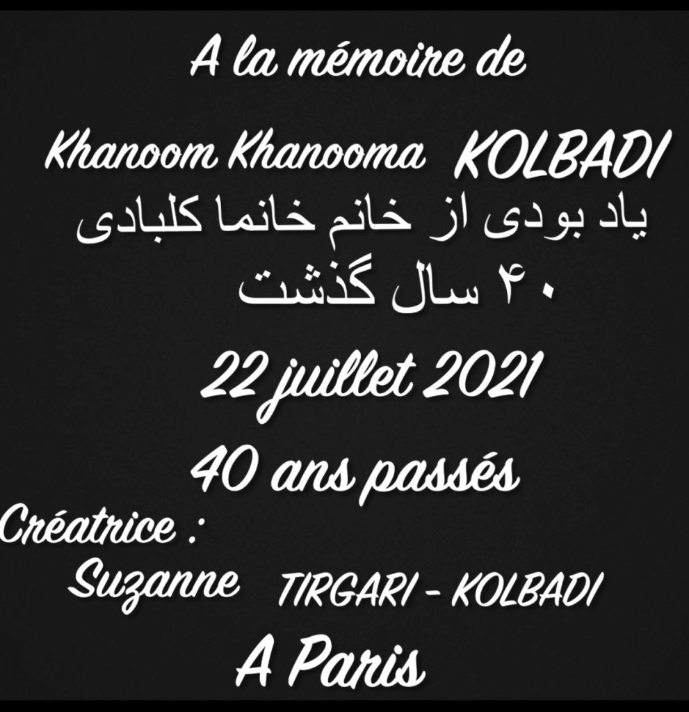 REZA est décédé jeune le 7 décembre 2020, mais il est inoubliable et restera toujours dans le cœur . REZA a toujours été fier d’être l’un des petits-enfants de Khanoom Khanooma KOLBADI, je l’ai lui ai envoyé dans le ciel à côté de ma douce Maman (KHANOOM KHANOOMA). REZA était l’une des personnes de la famille qui faisait l’aumône à ma douce Maman (Khanoom Khanooma) chaque année. Je remercie sincèrement qu’il a donné la charité et aussi pour les efforts qu’il a faits pour le manoir de Kolbadi (Garage Hayat).