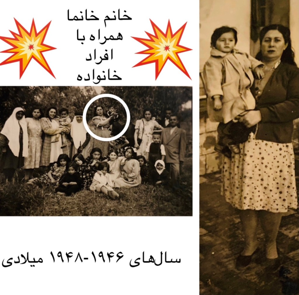 عکس خانوادگی سال ۱۳۲۴ : شيرين خانم که نوه ها او را نئی نه صدا ميکردند و مادر خانم خانما ميباشد، مشتی خاله ، خالهٔ خانم خانما همراه با دختر های خانم خانما سيمين، ماهسيم که نوه های شيرين خانم ميباشند و همچنين باقی افراد خانواده