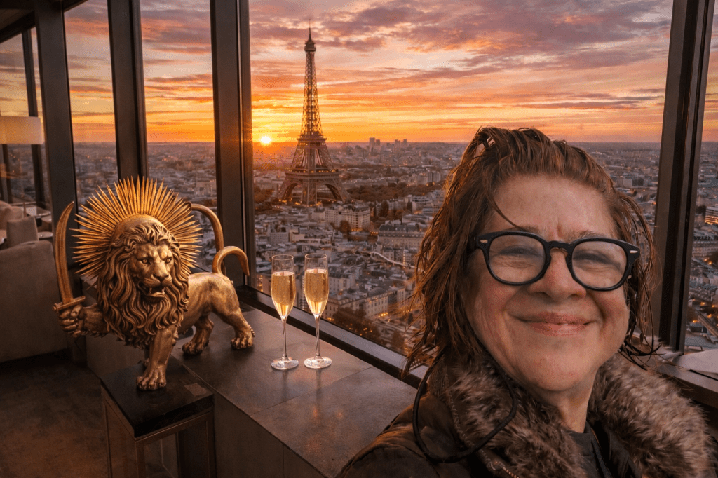 où la lumière dorée du lion et du soleil se pose sur les pavés anciens, et où la Tour Eiffel brille doucement dans le ciel.