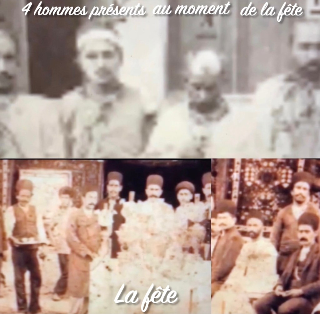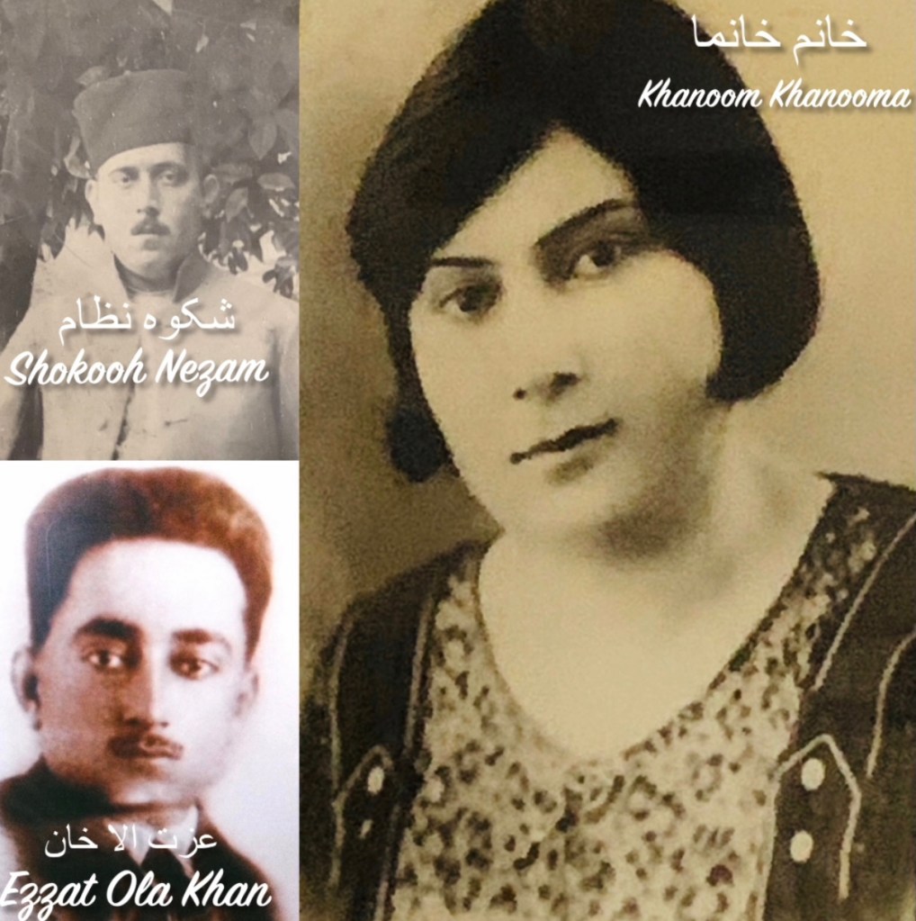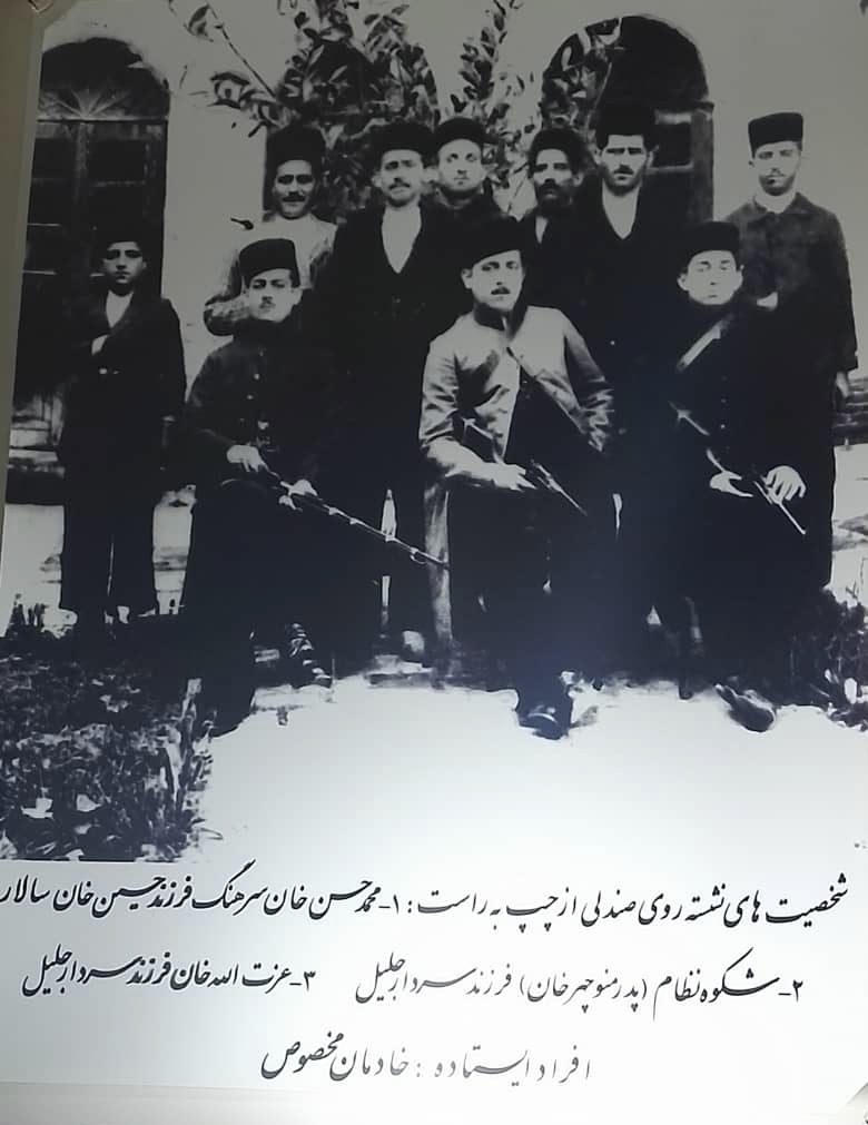 Personnages assis sur une chaise de gauche à droite : le colonel Mohammad Hassan Khan (fils de Hussein Khan Salar Kolbadi et le frère d’Ali Akbar Khan époux de Khanoom Khanooma ), Shokooh Nezam (fils de Sardar Jalil Kolbadi et père de Manouchehr Khan), Ezzat Ola Khan (fils de Sardar Jalil Kolbadi)